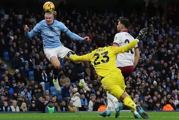 Erling Haaland scores Manchester City’s second goal against West Ham United.