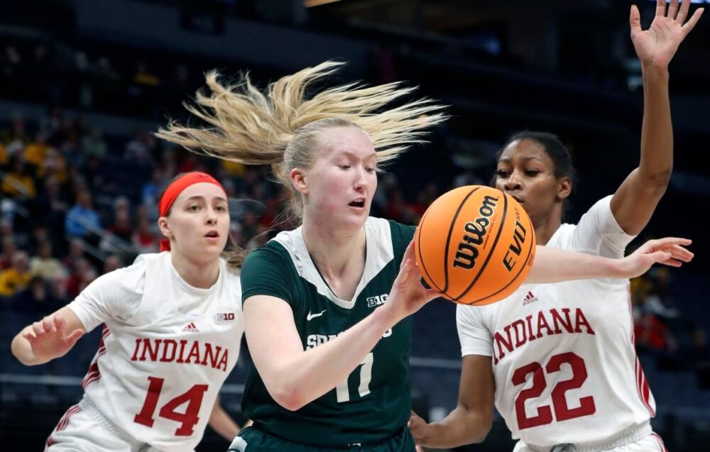 MINNEAPOLIS — Mackenzie Holmes scored 27 points and Sara Scalia added 20 as second-ranked and top-seeded Indiana overcame a slow start to hold off Michigan State 94-85 in the quarterfinals of the Big Ten Tournament.