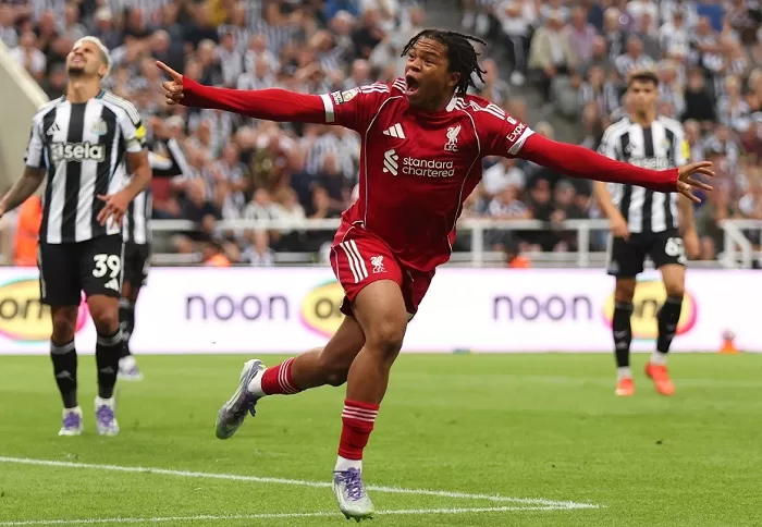Ryan Gravenberch and long-time Newcastle target Hugo Ekitike struck for the English champions, either side of Anthony Gordon’s red card for a wild lunge on Virgil van Dijk.