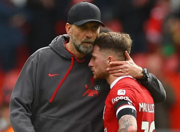 Jurgen Klopp consoles Alexis Mac Allister after Liverpool's devastating home defeat by Crystal Palace.
