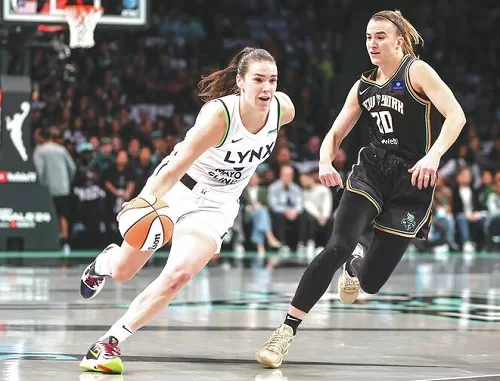 Minnesota Lynx forward Bridget Carleton (6) drives past New York Liberty guard Sabrina Ionescu (20) in Game 1 of the WNBA Finals.