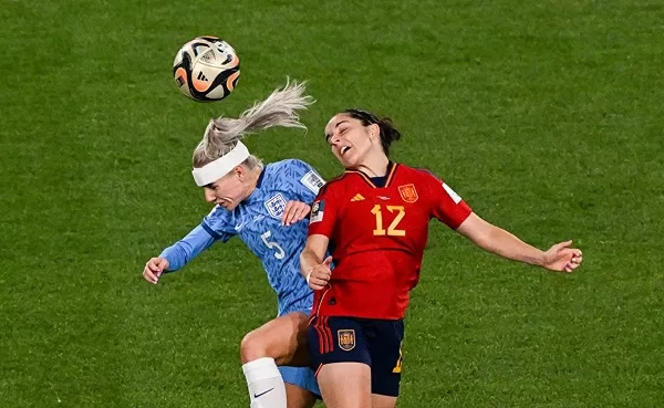 England's Alex Greenwood (L) and Spain's Oihane Hernandez fight for the ball during the 2023 Women's World Cup final in Sydney on Aug 20, 2023.