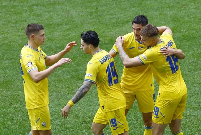 Ukraine's players celebrate after scoring against Slovakia during Group E match on June 21, 2024.