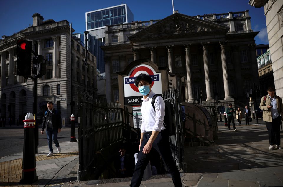 A person walks past Bank underground station during morning rush hour, amid the coronavirus disease (COVID-19) pandemic in London.