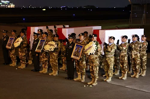 Indonesian military personnel carry coffins of United Nations Interim Force in Lebanon (UNIFIL) peacekeepers killed in Lebanon, during a military honour ceremony at Soekarno-Hatta International Airport, in Tangerang, on the outskirts of Jakarta, Indonesia, April 4, 2026.