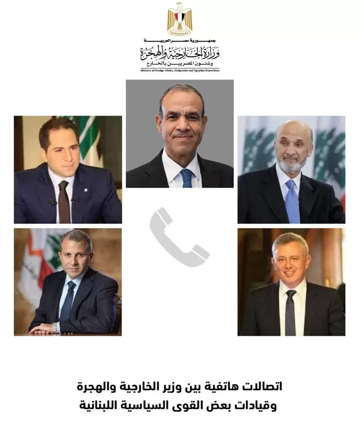 This came during phone calls made by Abdelatty with a number of heads of Lebanese political parties and movements, including Samir Geagea, head of the Lebanese Forces Party, Samy Gemayel, head of the Kataeb Party, Suleiman Frangieh, head of the Marada Movement, and Gebran Bassil, head of the Free Patriotic Movement.