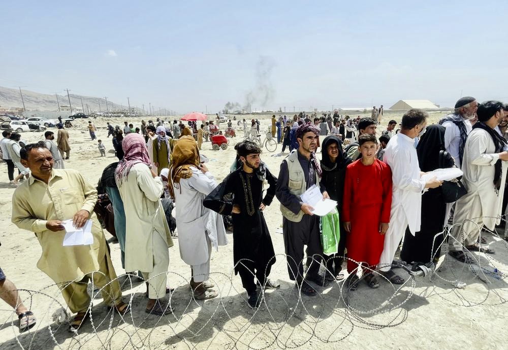 Hundreds of people gather outside the international airport in Kabul, Afghanistan, Tuesday, Aug. 17, 2021.