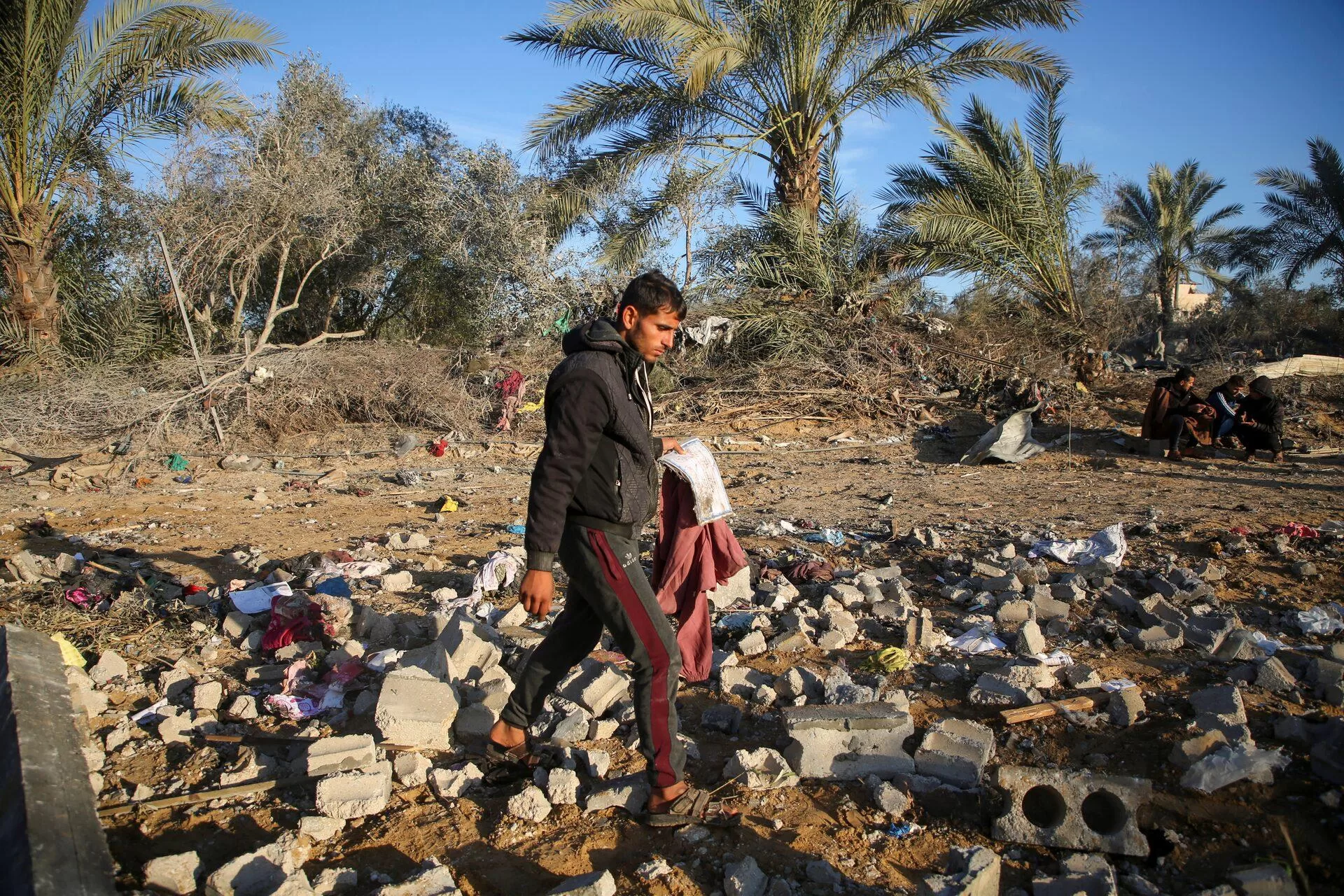 A Palestinian man inspects the site of an Israeli strike on a house, amid the ongoing conflict between Israel and Hamas, in Khan Younis in the southern Gaza Strip, January 14, 2025
