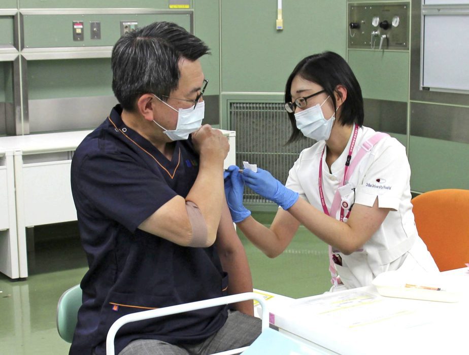 A doctor receives a Covid-19 booster shot at Chiba University Hospital in Chiba, Japan.