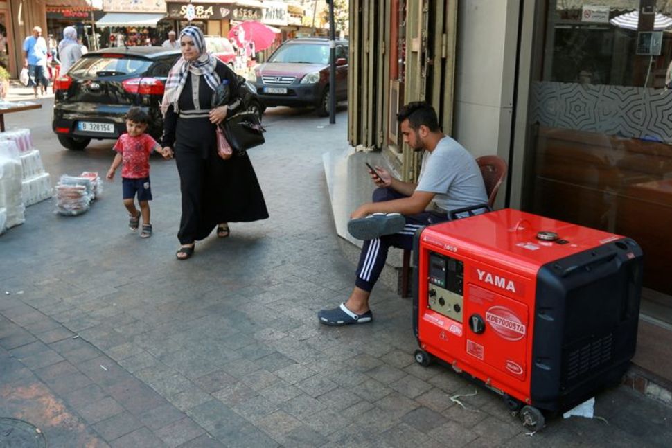 A woman with a child walk past a portable generator, which provides electricity, in Sidon, Lebanon, August 11, 2021. Picture taken August 11, 2021.