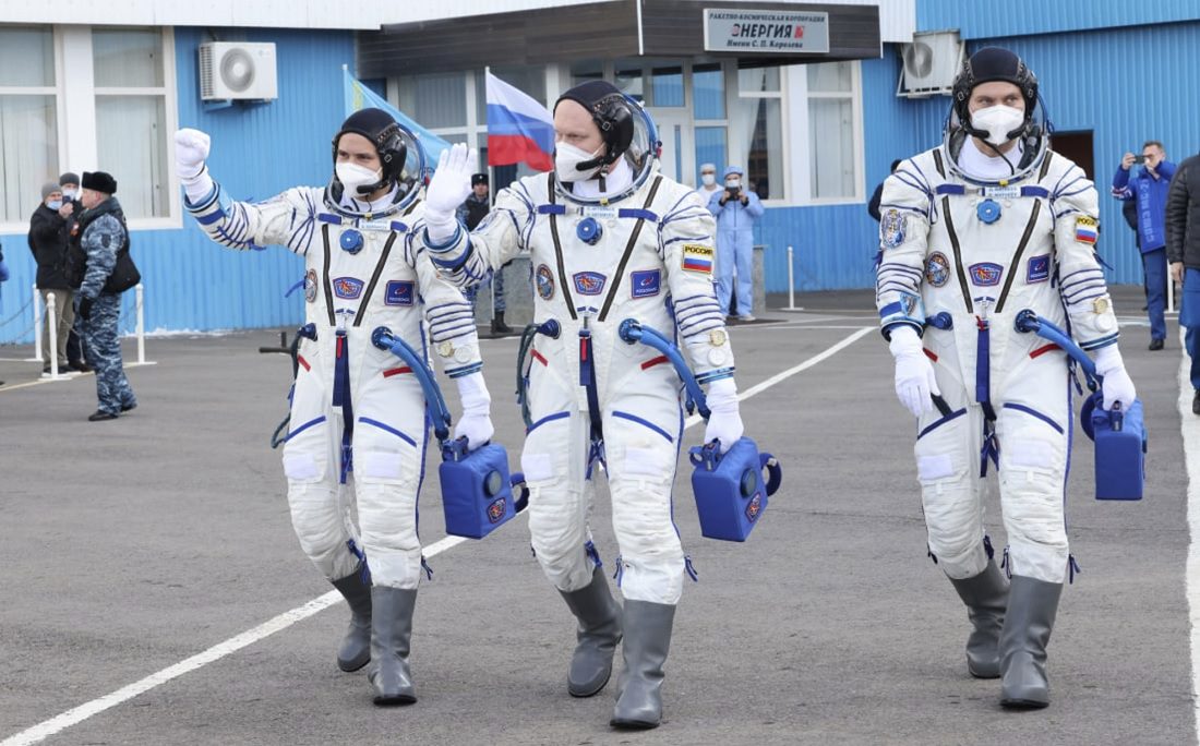 In this photo released by Roscosmos Space Agency, Russian cosmonauts, commander leg rtemyiv, centre, flight engineers Denis atveev, right, and Sergei Korsakov, members of the main crew to the International Space Station (ISS), walk prior to the launch at the Baikonur Cosmodrome, Kazakhstan, on March 18, 2022.