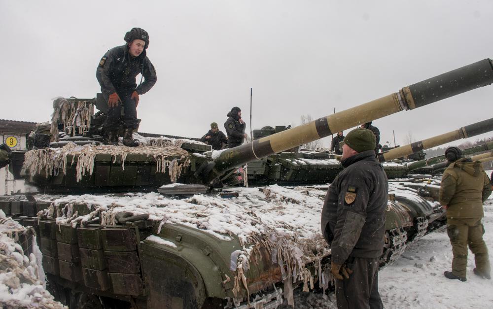 Ukrainian soldiers examining their tanks at a military unit close to Kharkiv, Ukraine.