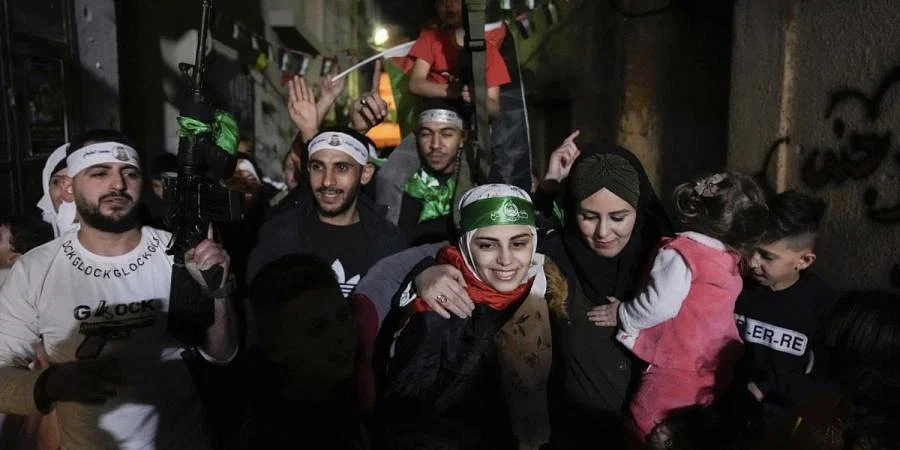 In the Israeli-occupied West Bank, fireworks exploded and crowds filled the street where they hoisted aloft young men who had been freed from prison. Wearing identical grey jumpers, they waved Palestinian and Hamas flags.