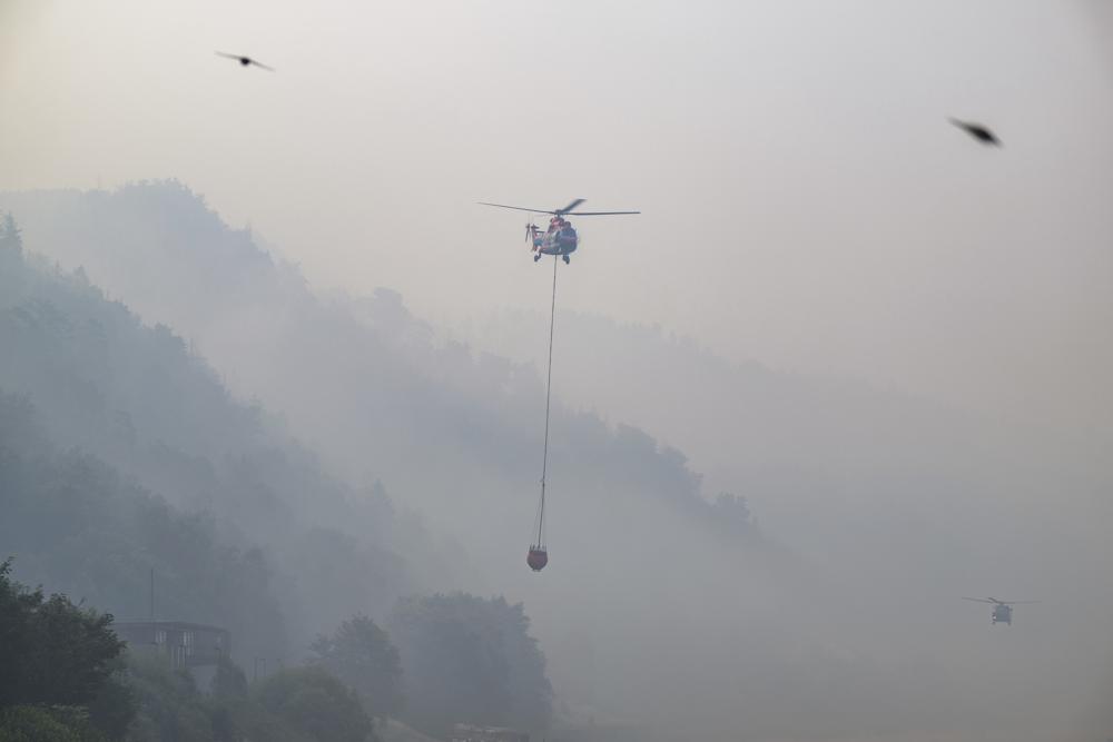 A cargo helicopter from Austria takes water from the Elbe River with an external water tank to extinguish a fire in the Saxon Switzerland National Park, Schmilka, Germany. The forest fire in the Saxon Switzerland National Park is spreading.